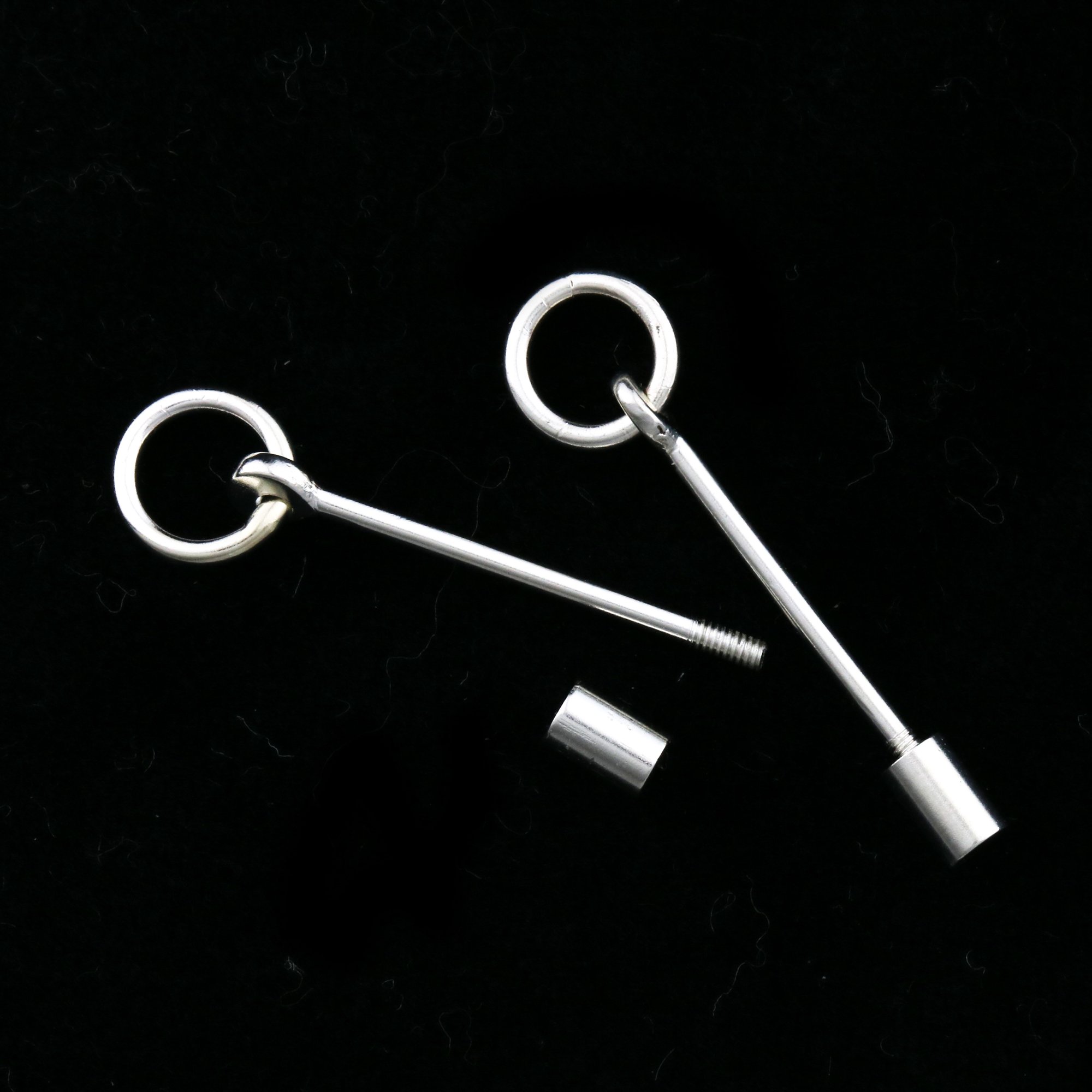 Handcrafted in sterling silver, these interchangeable earrings are sold in pairs in various length fitting beads with 1/16" hole. Unscrew the 1/8" diameter cylindrical nut on the bottom to thread on the bead. (Unlike individual interchangeable pendant, these do NOT come with the 1/4" diameter disc so beads with holes 1/8" or larger will NOT work sliding off the cylindrical nut.) Finger tighten securely with a rubbery or silicone material (such as a shelf/drawer liner) is recommended. Select the length to fit the size of your pair of beads.